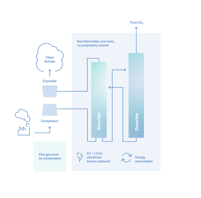 Potassium carbonate is a widely available, cost-efficient solvent. Additionally, energy recovery features help repurpose heat for industrial use, while flexible power options enhance adaptability.
